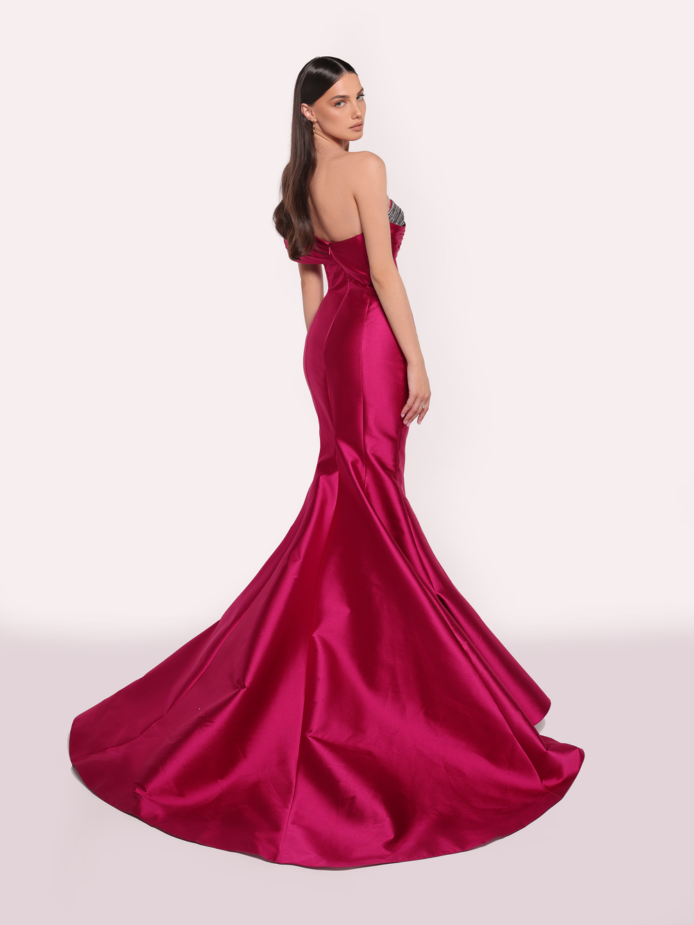 An elegant one-shoulder gown with a fitted silhouette and a dramatic mermaid skirt. The asymmetrical neckline is complemented by a beautifully draped shoulder detail, while the bodice reveals a hint of sparkle, adding a touch of glamour.