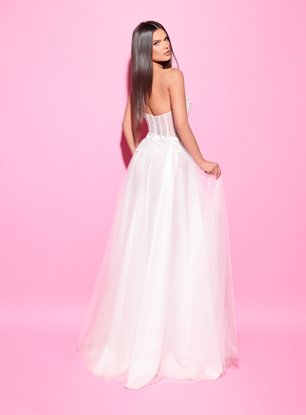 This ethereal gown features a structured corset bodice adorned with delicate floral appliqués, flowing into a full tulle skirt. The strapless design enhances the neckline, creating a romantic and graceful silhouette perfect for memorable occasions.