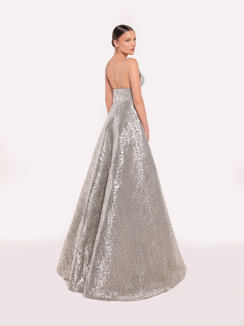 This stunning gown features a delicate V-neckline with thin spaghetti straps, perfectly balancing elegance and modern charm. The textured fabric and fitted bodice flow into a full skirt, creating a timeless silhouette ideal for grand occasions.