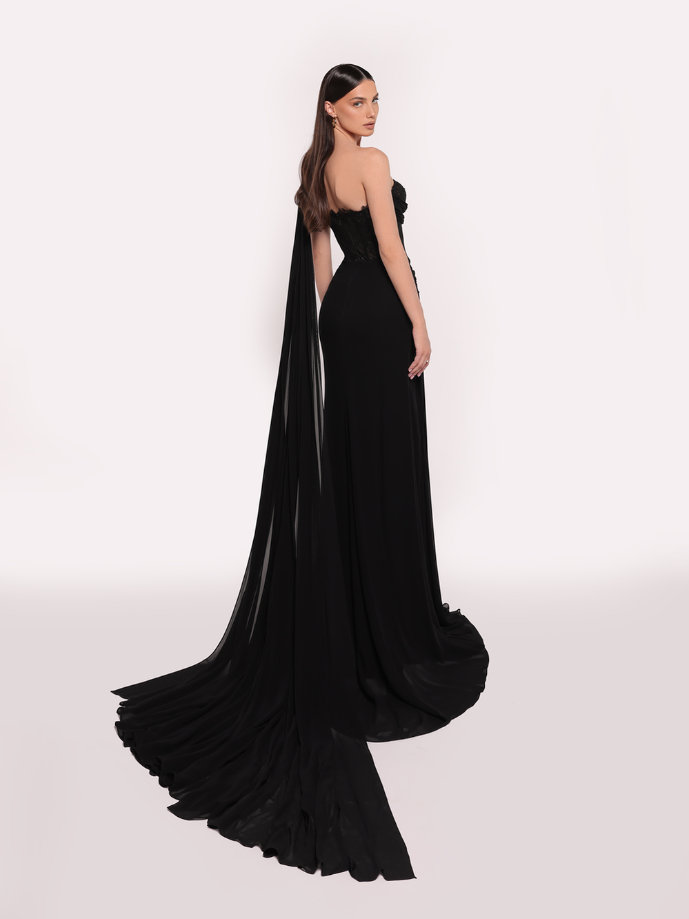 An alluring one-shoulder gown featuring a lace-embroidered bodice with a sheer effect, elegantly contrasted with a draped fabric that cascades down to a flowing train. This design merges sensuality with sophistication, making it perfect for a refined evening look.