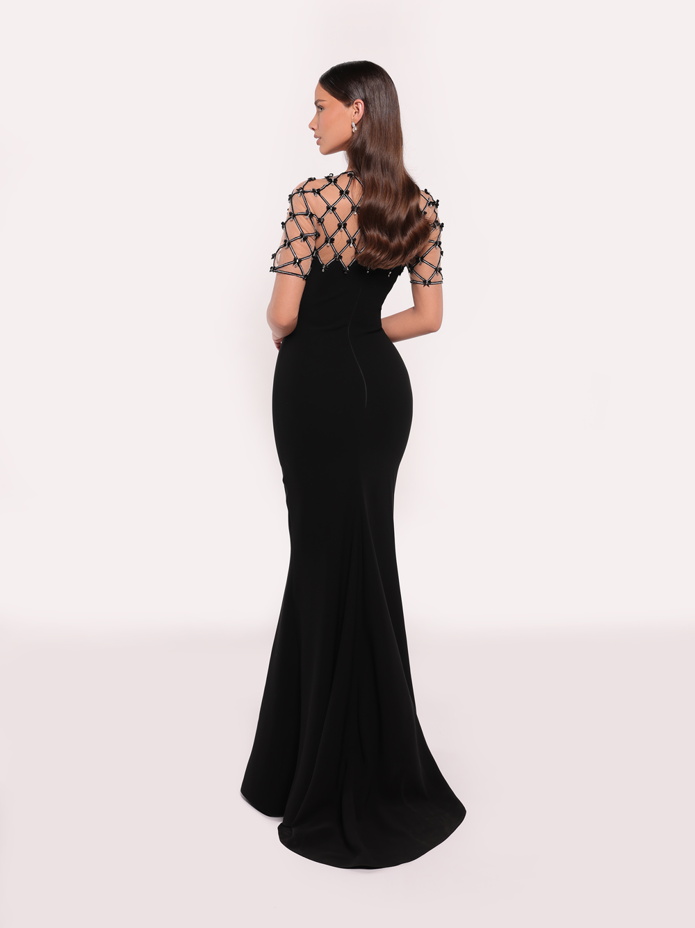 A statement of elegance, this gown features a fitted silhouette that flows gracefully to the floor. The standout detail is the intricate, embellished net overlay that forms a high neckline and short sleeves, adding a bold yet refined touch to the classic design. Ideal for those who seek a sophisticated, high-impact look with a modern twist.