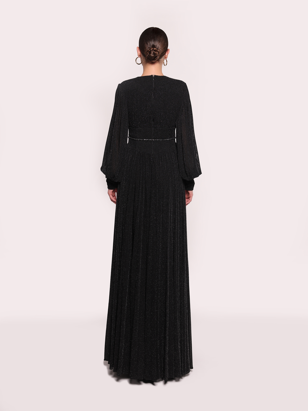 This elegant gown features a deep V-neckline and relaxed, flowing sleeves, exuding a timeless sophistication. The design is completed with a delicate waist tie that adds a graceful finish to the look.
