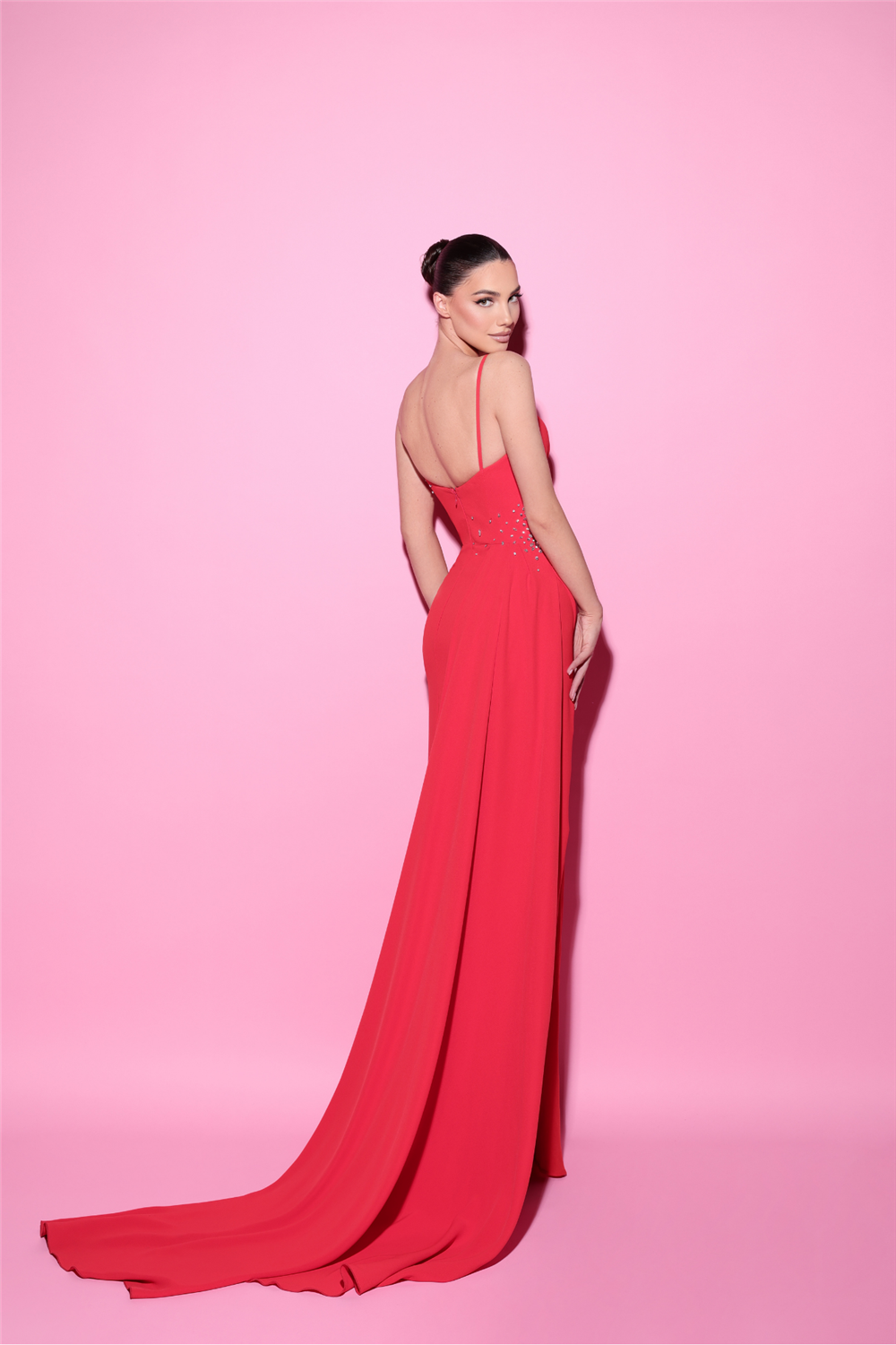 This captivating gown is designed with a sweetheart neckline and delicate spaghetti straps, adorned with shimmering embellishments. The fitted silhouette accentuates the figure, while a high slit and a flowing side train add movement and allure.