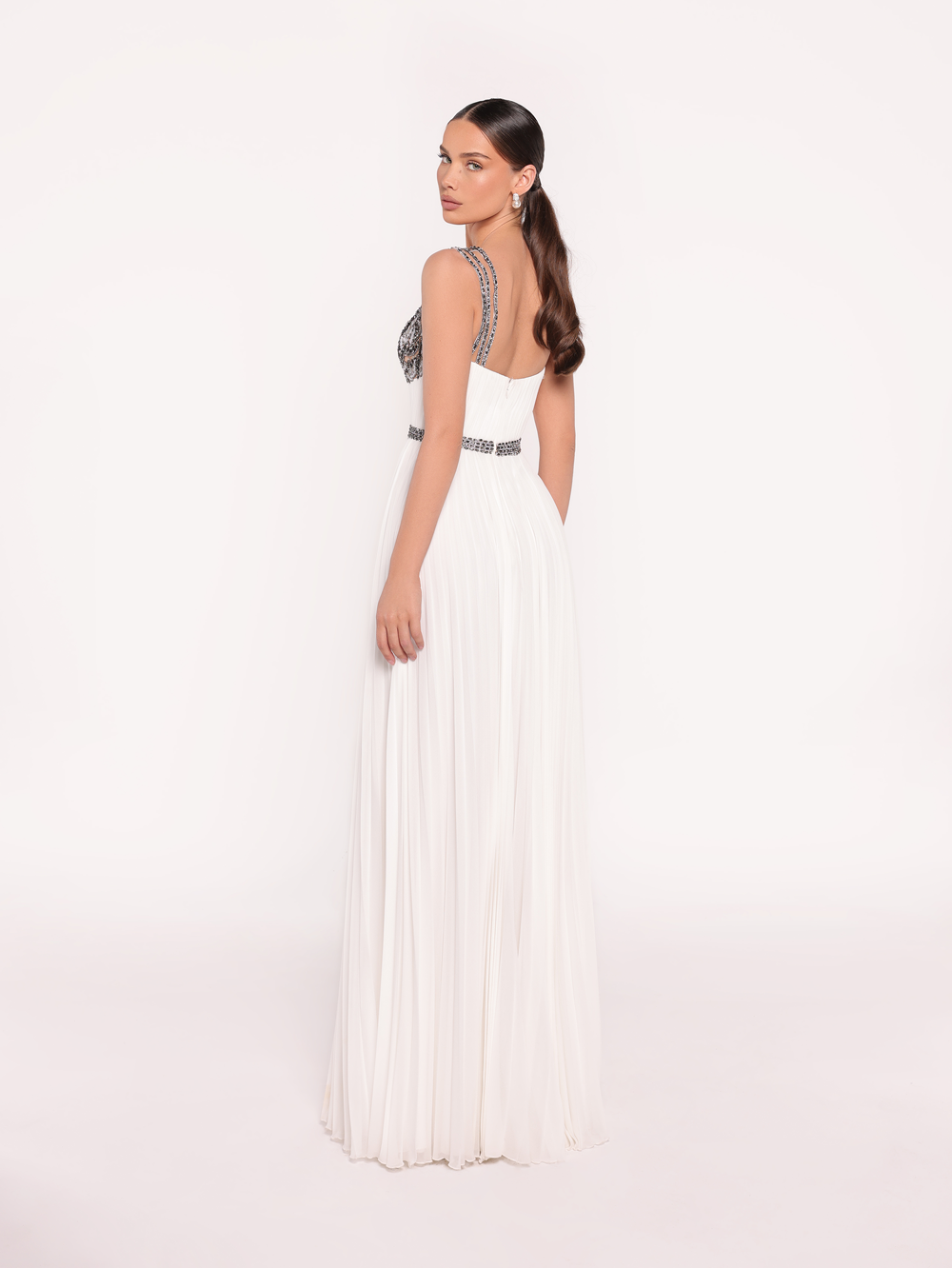 This gown exudes elegance with its asymmetrical, intricately embroidered bodice that adds an artistic touch to the shoulder line. The flowing pleated skirt falls gracefully, cinched at the waist with a delicate embellished belt, creating a soft and flattering silhouette. Ideal for those seeking a refined and unique look with a touch of artistry.