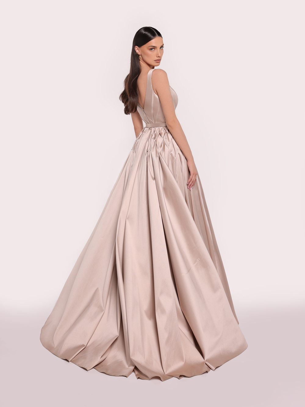 This gown combines modern sophistication with a touch of classic elegance. Featuring a plunging V-neckline that highlights the décolletage, it is cinched at the waist with a belted detail, adding structure to the voluminous skirt. The luxurious fabric gathers into intricate pleats, creating a regal and statuesque silhouette, perfect for a grand evening affair.