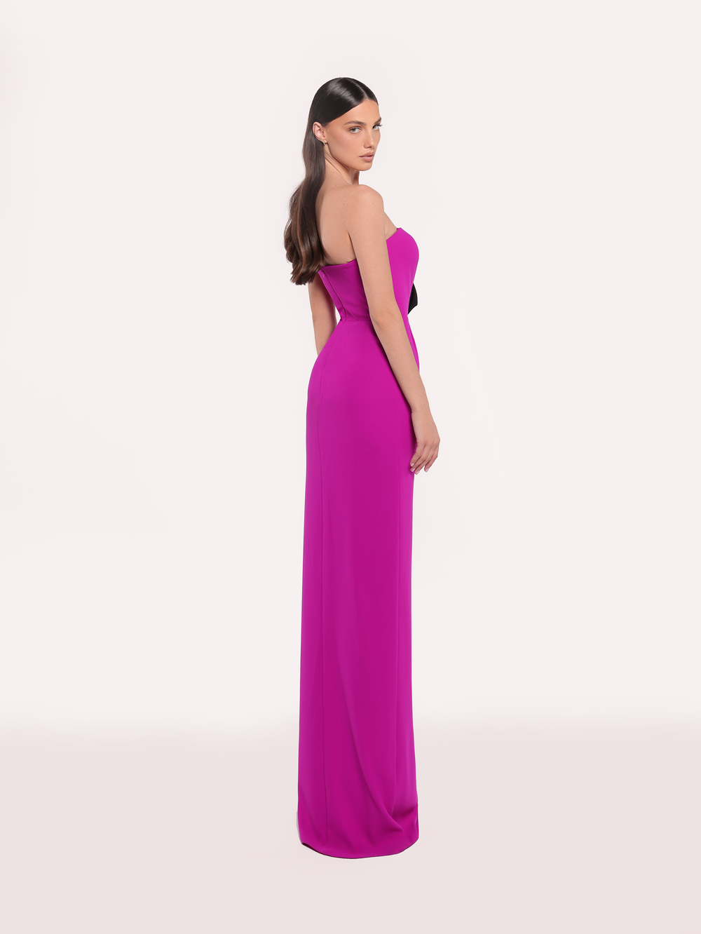 This elegant strapless gown in a striking shade features a sleek silhouette and a draped detail accentuated by a bow at the waist. A thigh-high slit adds a daring touch, perfect for making a refined yet bold statement at any formal event.