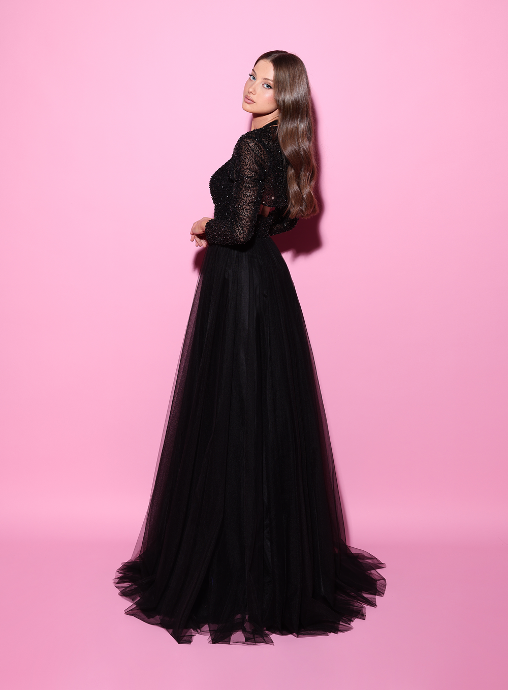 This ethereal gown combines elegance with allure, featuring a deep V-neckline embellished with subtle sparkle. The flowing tulle skirt adds a dreamy touch, perfect for a sophisticated evening look.