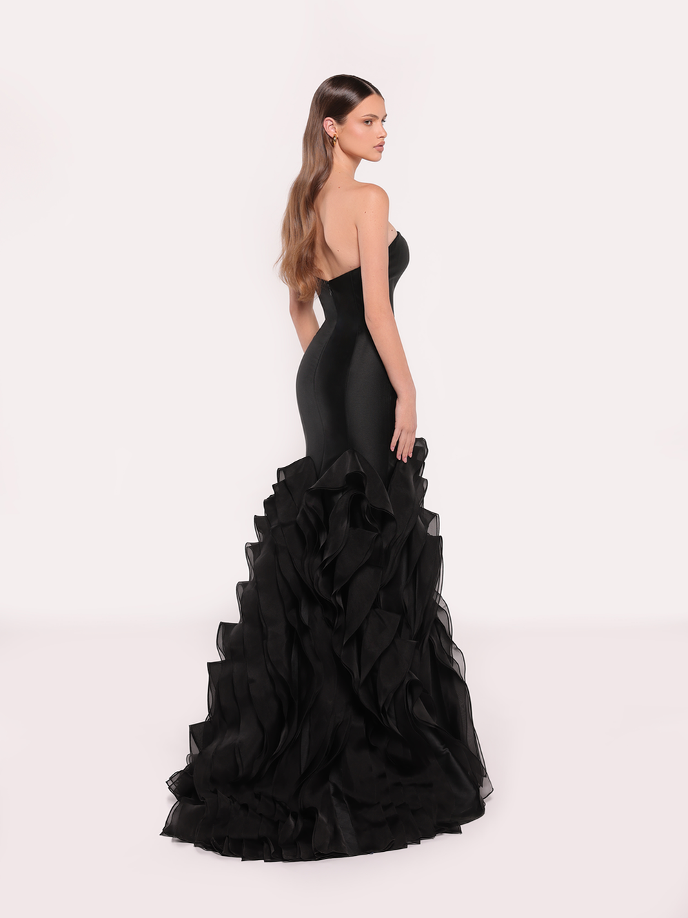 This strapless gown is a true masterpiece of elegance and drama. The fitted bodice cascades into a voluminous mermaid skirt adorned with layers of delicate ruffles, creating a captivating and graceful silhouette.