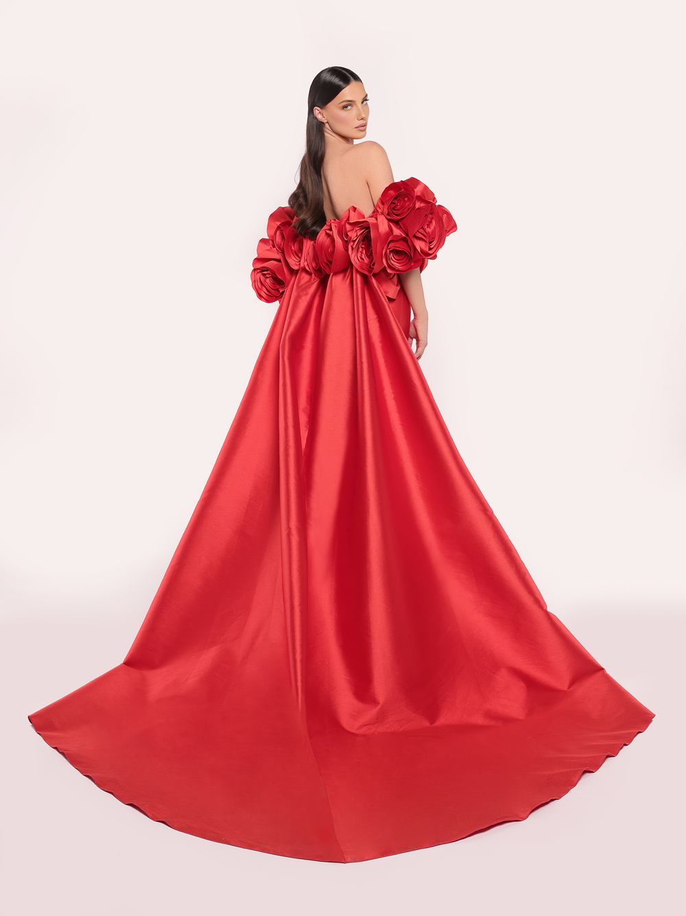 A dramatic off-shoulder gown that exudes romance and elegance. The structured bodice flows into a voluminous skirt, with oversized floral accents adorning the cape, creating an unforgettable look perfect for making a grand entrance.